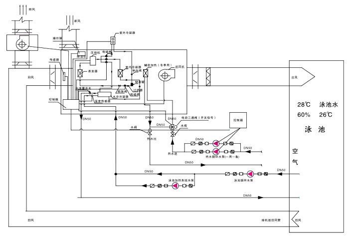 機組工作原理圖:輔助加熱系統水管接自鍋爐熱水;風管的尺寸參數,送、回風風管圖,水系統水管管徑如圖所標。